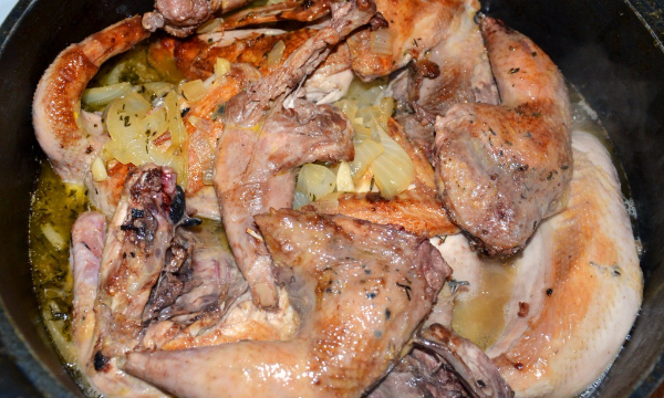 Набор ингредиентов достаточно прост и доступен. Вино используем белое сухое, самое недорогое из натуральных. Оливки - без косточек.Обжаренные куски складываем в отдельную емкость, добавляем в сковород...
