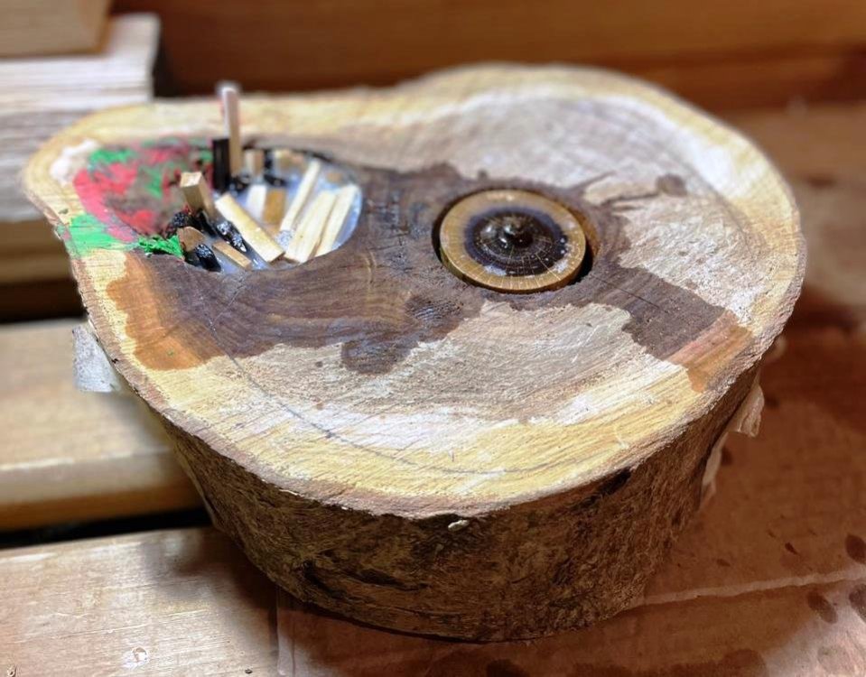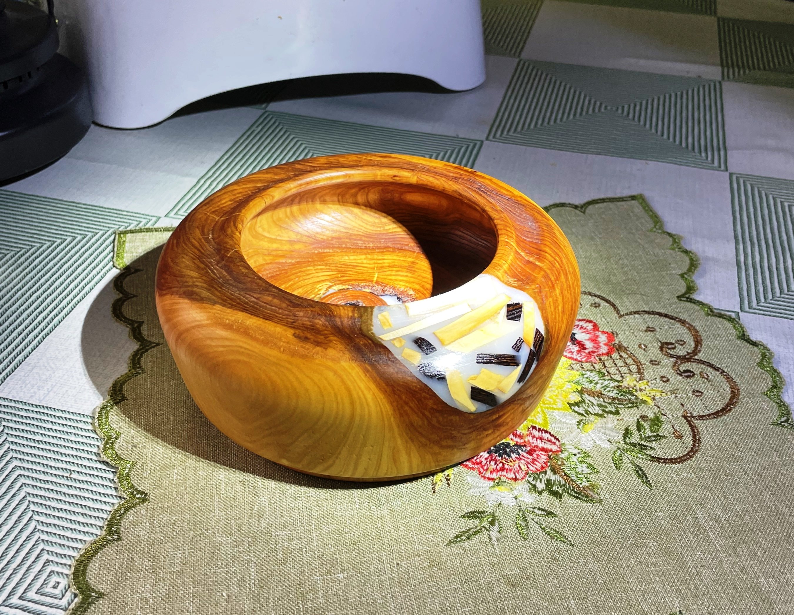 Вот горшок пустой, он предмет простой (с) Торцовый спил рябины. Дырку от сучка и рыхлую сердцевину вычистил, забил буковыми вкладышами, добавил кусочков клёна и красного дерева и всё залил эпоксидкой. Потом убрал лишнее, получилась довольно массивная плошка с декором. Диаметр 16,5 см и высотой 7 см.