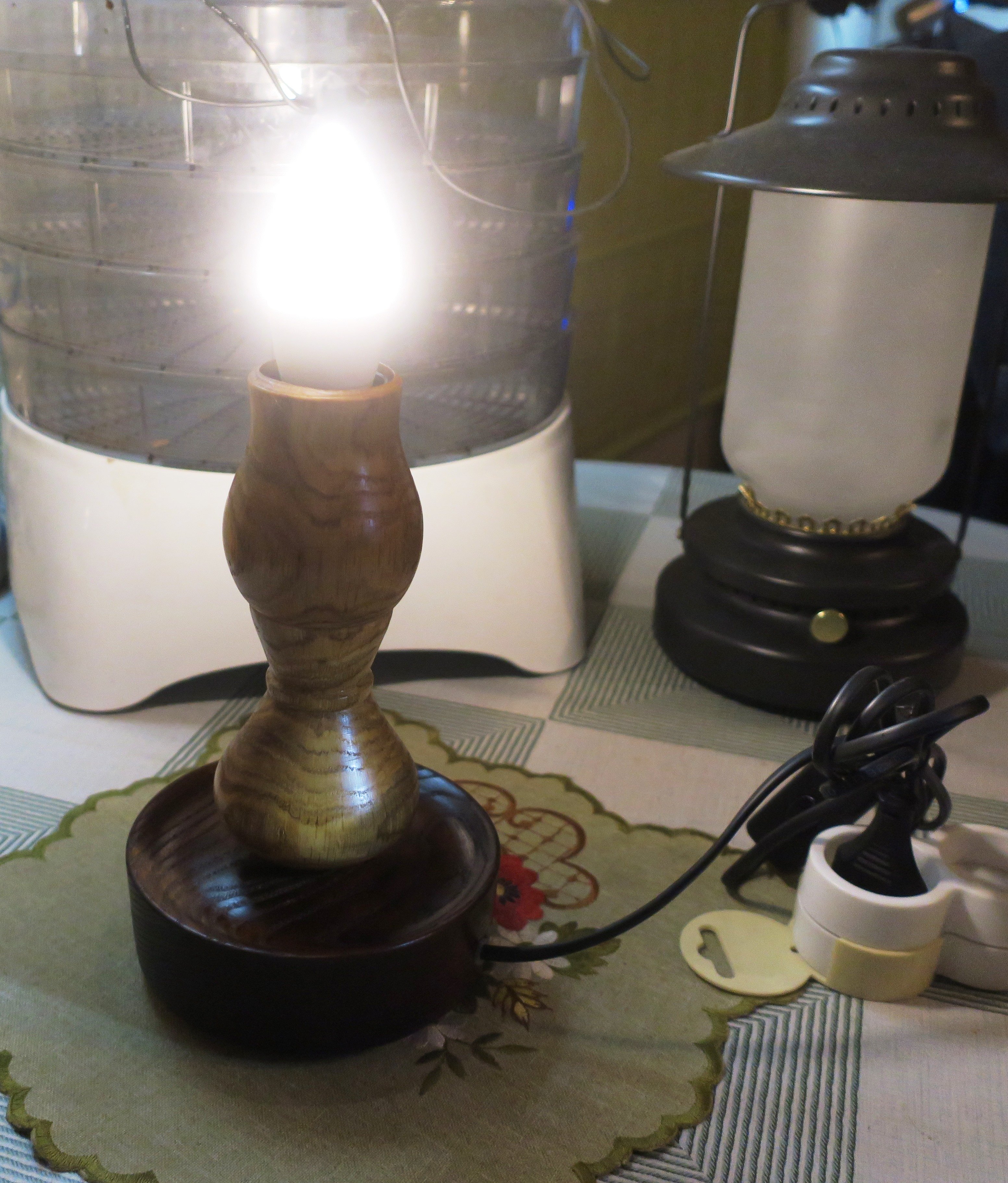 А вот есть такие лампочки, которые имитируют горение свечи. Соорудил под такую подсвечник. Задумано, как ночник. Чьё-то дело задумывать, наше дело - исполнять. Основание - термоясень, всё остальное - дуб. У меня такой хитрой лампочки нет, поэтому ввернул обычную для блезира. Завтра уедет к заказчику.