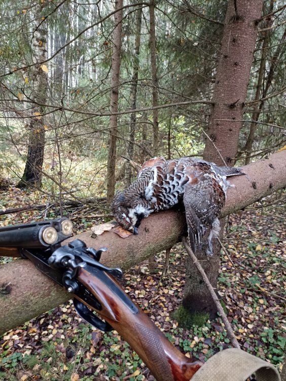 Наконец то после недели безрезультатных прогулок по лесу добыл первого в сезоне петушка. Что характерно, за все дни только один раз слышал отклик самочки. Уже начал думать, что пока я ожидал своего отпуска, всех рябчиков уже упокоили более расторопные коллеги. Сегодняшний петушок тоже не удостоил меня беседой, подлетел молча. О его присутствии оповестил только характерный Фрррр. Пару раз потихоньку посвистел ему, и вот он, красавец, метрах в 15 отчетливо виден. Ну что же, один трофей за отпуск - это тоже результат