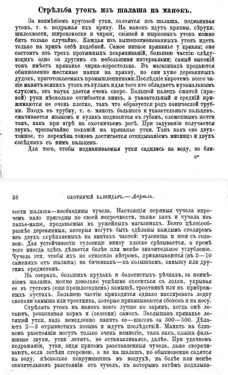 Мнение помещика, изданное на деньги купца, - достоверное описание охотничьей традиции? А. П. Сабанеев, "Охотничий календарь", апрель. Описано применение манка, чучел и стрельба по сидячим на воде. -