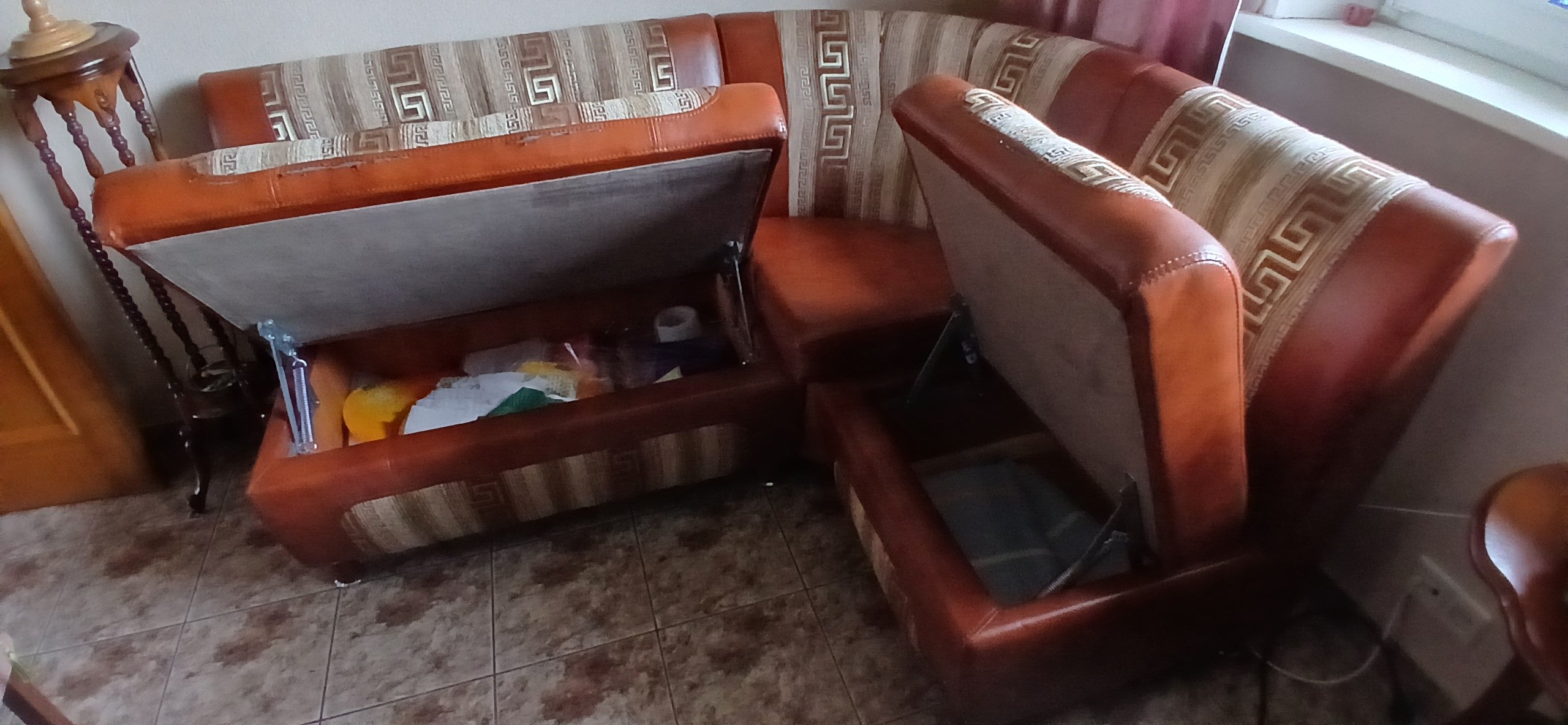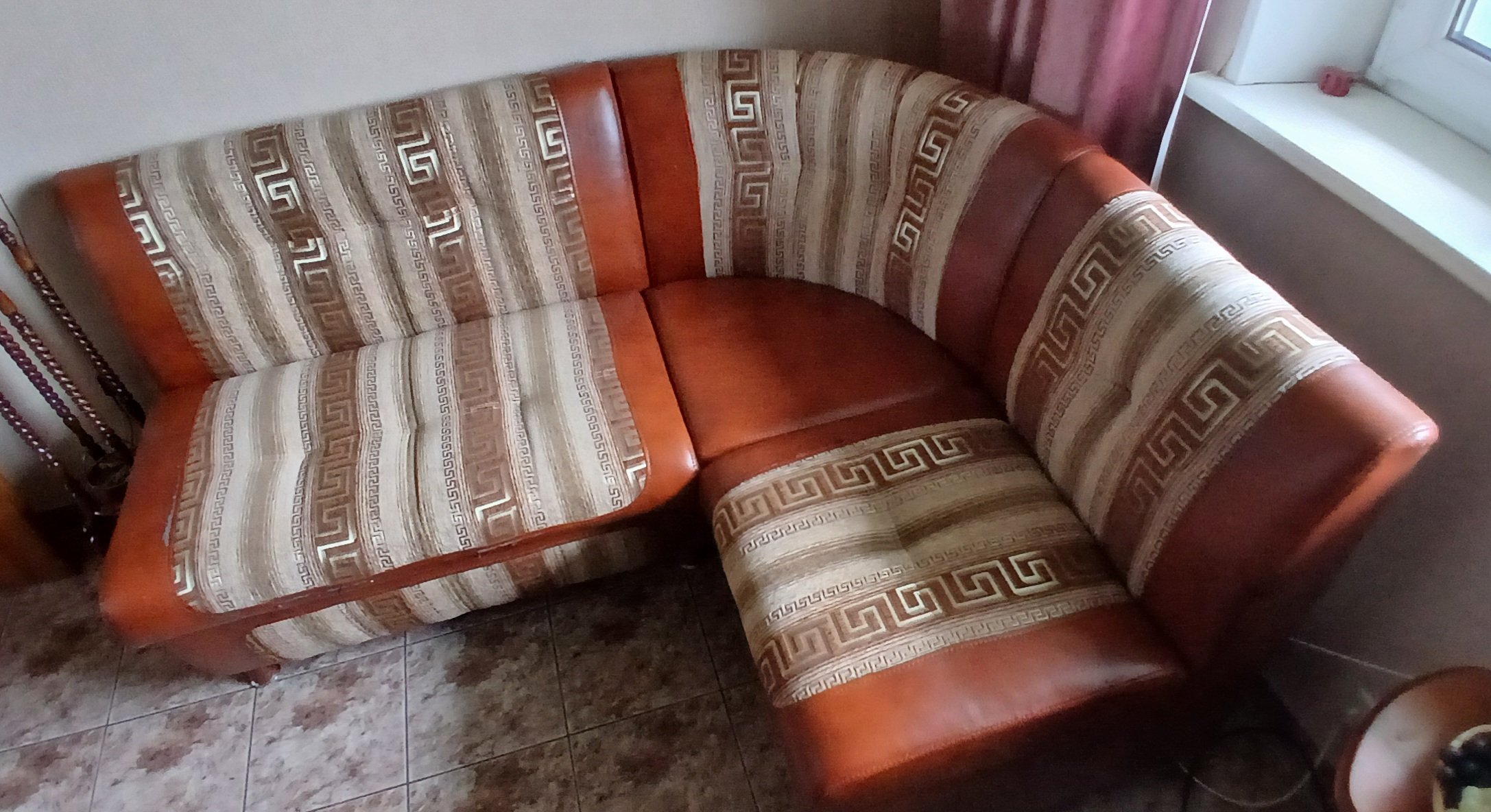 Размер 150×115. Крепкий, мягкий. Не шатается, ничего не болтается не скрипит. Фурнитура полностью рабочая. Под сидениями ниши. Чистый, без запахов. Есть дефекты обивки (на фото) . Разбирается на 3 части. Вывоз М. Красногвардейская