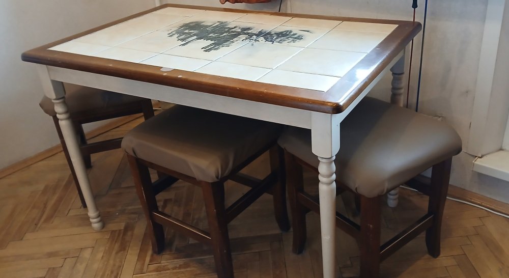 Стол 112×73. Массив дерева, покрытие керамическая плитка. Плюс три табуретки. Не шатаются не скрипят, очень крепкие. Дефекты на фото. Самовывоз М. Новогиреево