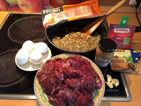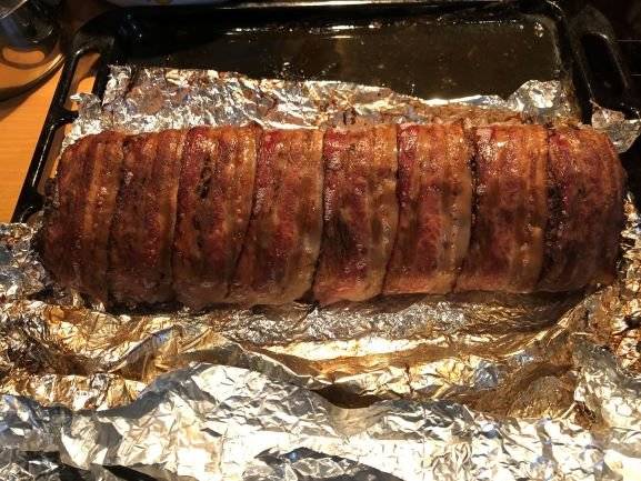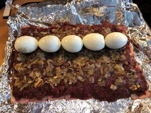 Бобер - это не только ценный мех и струя, но и полезное диетическое мясо (которое, говорят, можно есть даже в пост ). Ростбиф (он же может быть назван рулетом, но с оговорками) - довольно простое блюдо, готовится если не быстро, то уж точно с не очень большими трудозатратами. Для приготовления ростбифа понадобятся мясо (примерно 1 кг), лук, чеснок, горчица (лучше с зернышками), специи (я люблю зиру и паприку), варёные яйца, бекон. Мясо бобра, чтобы не пахло, я помещаю в морозилку, и через какое-то количество дней достаю и готовлю. Я не вымачиваю, как кто-то советует. По моим наблюдениям, если мясо свежее, только добытое, то как его не вымачивай, запах бобра остаётся, больше или меньше. А вот после морозилки он почти пропадает, готовка же со специями убирает его окончательно. Но, конечно, если кто-то любит бобрятину именно за её запах, всегда можно добавить в блюдо чуть струи ) 1. Делаю из мяса фарш - пропускаю через мясорубку с чесноком, добавляю соль, специи и полбанки горчицы, все перемешиваю, даю постоять полчаса. 2. Репчатый лук обжариваю на сковороде. Лука много не бывает, можно взять 3-4 средние луковицы. 3. Беру крепкую фольгу, на ней стелю ковер из бекона. 4. На бекон выкладываю ровным слоем фарш. 5. Поверх слоя фарша настилаю слой жареного лука. Подсаливаю лук. 6. На луке раскладываю яйца. 7. Затем всё это заворачиваю в рулет и запечатываю фольгу, получается полено. Оно отправляется в духовку на час на 180 град. 8. Через час достаю полено, разрезаю и открываю фольгу и снова отправляю в духовку на максимальную температуру и верхний гриль, на 15 минут. Готово будет, когда бекон зажарится до хрустящей корочки. 9. Все готово! Кстати, часть этого ростбифа я привозил на пробу на нашу форумную встречу 14.03.20, кому-то удалось попробовать .
