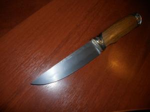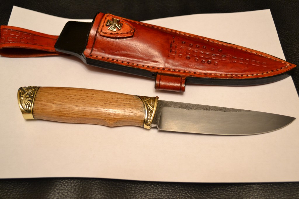Характеристики : стальУ10 ,Твёрдость 58-59 . Дл. Клинка- 125мм, шир.- 29мм,толщ- 4.2 мм, спуски 2\3 , сведение 0.3 мм , зонная закалка –хамон. Рукоять – дуб , больстр и тыльник литьё –латунь, пропитана Даниш Оил. ,дл. 125 мм. Ножны – натуральная кожа, свободного и жёсткого подвеса с проушиной под огниво –ф8мм. Продаётся в Московской области ,пересыл в любой регион. Цена ножа 4500р.