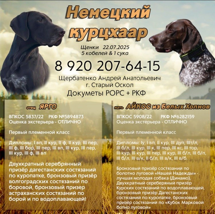 Щенки курцхаара, рождены 22.07.2025г. Вязка запланирована Белгородским ООиР. Кобели/суки - 5/1 Документы - РОРС/РКФ Локация: Белгородская обл., Старый Оскол. Доставка в другие регионы возможна по предварительной договорённости. Тел: +7-920-207-64-15 (WhatsApp, Telegram) . отец - ЯРГО, 20.03.2020гр., РКФ 5894873, ВПКОС 5837/22, клеймо GFY 1285 (ТОМ, ВПКОС 4875/18, Красненко И.В. – ЧИАРА, ВПКОС 5074/19, вл. Стрельцов О.О.) вл. Головачёв А.М. Экстерьер - ОТЛИЧНО, I племенной класс Дипломы: 2-IIкур., 2-IIIкур., 1-IIф., 3-IIIф., 3-пер.; 1-Iу., 2-IIу. 3-е место Волгоградские открытые состязания собак легавых пород по боровой дичи 07 - 09 октября 2022г. 2-е место 2-е Открытые Дагестанские республиканские состязания легавых собак по куропатке 01-02 апреля 2023г. 3-е место Астраханские состязания собак легавых пород по боровой дичи (фазан) Кубок клуба "ОХОТНИК КАСПИЯ" 28-29 октября 2023г. 3-е место Астраханские межпородные состязания охотничьих собак по водоплавающей птице 06-07 сентября 2024г. 2-е место 4-е Дагестанские межрегиональные состязания легавых по куропатке 05-06 апреля 2025г. 3-и Открытые Дагестанские состязания легавых собак по полевой дичи (куропатка) памяти эксперта Всероссийской категории С.П. Слюсаря 30-31 марта 2024г. 18-е Орловские межпородные состязания легавых собак по полевой дичи памяти И.С.Тургенева, 05-06 июня 2021г. Всего 14 дипломов по рабочим качествам. база РОРС: https://rors.ru.ruswebs.ru/dog/yargo мать - АЙКОС ИЗ БЕЛЫХ ХОЛМОВ,. 05.07.2021гр., РКФ 6282159, ВПКОС 5908/22 (ЯХОНТ, РКФ 5130399, вл. Косицин К.Г. - РОКСИ ИЗ БЕЛЫХ ХОЛМОВ, РКФ 5136552, вл. Кривошеев А.М.) вл. Щербатенко Андрей Анатольевич Экстерьер - ОТЛИЧНО, I племенной класс Дипломы: 1-IIкур., 4-IIIкур., 1-IIб/л., 6-IIIб/л., 2-IIIпер., 1-IIIбор.; 2-Iу., 2-IIIв/к, 1-IIIкр/сл, 1-IIIв/б. 3-е место Открытые состязания молодых легавых собак до 3-х лет «НАШИ НАДЕЖДЫ» 26-28 мая 2023г., Владимирская обл., угодья ВФСО «Динамо», 2-е место Курские областные состязания легавых собак по водоплавающей птице «КУРСКИЕ ЗОРИ 2023» 29-30 июля 2023г. 3-е место 4-е Дагестанские межрегиональные состязания легавых по куропатке 05-06 апреля 2025г. Дипломы РКФ: 2-е место состязания ранга САСТ по болотной и полевой дичи «ЭТАП КУБКА ЛИБЕРОВЕНТО. ЗАПАД. МОЛОДЫЕ» 11 апреля 2024г., Воронежская обл., Россошь. Всего 23 диплома по рабочим качествам база РОРС: https://rors.ru.ruswebs.ru/dog/aykos-iz-belyh-holmov Оба родителя работают в поле очень стильно, с широким и быстрым поиском. Собаки с отличным складом нервной системы, прекрасный баланс охотничьего азарта, страсти и уравновешенной психики. К моменту передачи будущим владельцам щенки будут чипированы, проклеймены и обработаны антигельминтными препаратами. С щенками сразу передаются два комплекта документов о происхождении: РОРС (Росохотрыболовсоюза) и РКФ (Российской кинологической федерации). Дата рождения 22.07.25. Любые вопросы, уточнения, разъяснения приветствуются. При необходимости и желании возможно дальнейшее сопровождение, помощь в выращивании и натаске в поле подрастающих помощников на охоте.