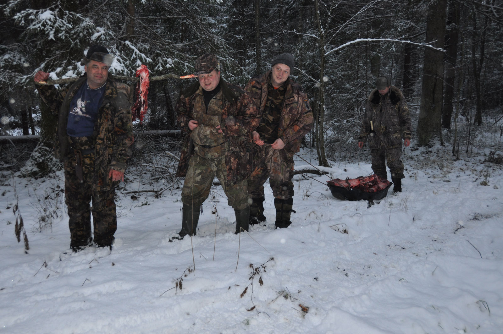 H_A_N Posted December 12, 2011 #1 Report Share Posted December 12, 2011 В минувшие выходные прошел очередной выезд на охоту в Тверскую область.Несмотря на то что команда более, менее набралась только в последний момент, выезд прошел достаточно удачно. В первый день, в первом загоне был взят лось.Номера перекрывали участок леса от поля до болота, егеря гнали с выстрелами.В какой-то момент мне показалось что несколько выстрелов были на линии номеров (потом оказалось что стреляли в соседнем лесу) и я думал что лось или даже не один взят.Поэтому когда на мой номер на краю болота вышел лось, я сомневался стрелять или не стрелять, с каждым шагом лось все дальше уходил в болото. Я все таки принял решение стрелять (сам ведь говорил на инструктаже, есть уверенность в выстреле, стреляйте), лось упал в 50 метрах от края болота.Как оказалось позже это был единственный лось вышедший на номера, остальные лоси ушли дальним краем болота. До машины лося выносили на руках и вывозили на «упряжке».Было желание загнать в болото Дениса на шишиге, но голос сверху сказал что делать этого не надо (как позднее выяснилось, голос сказал очень правильную вещь).На второй день мы полюбовались красотами зимнего леса, некоторые даже видели лосей, но все лоси прошли вне зоны выстрела.В завершении отчета, хочется выразить благодарность Денису за транспортные услугу и Вите за кулинарные изыски. H_A_N Quote Link to post Share on other sites More sharing options...