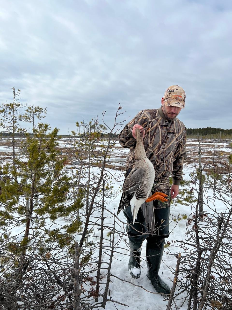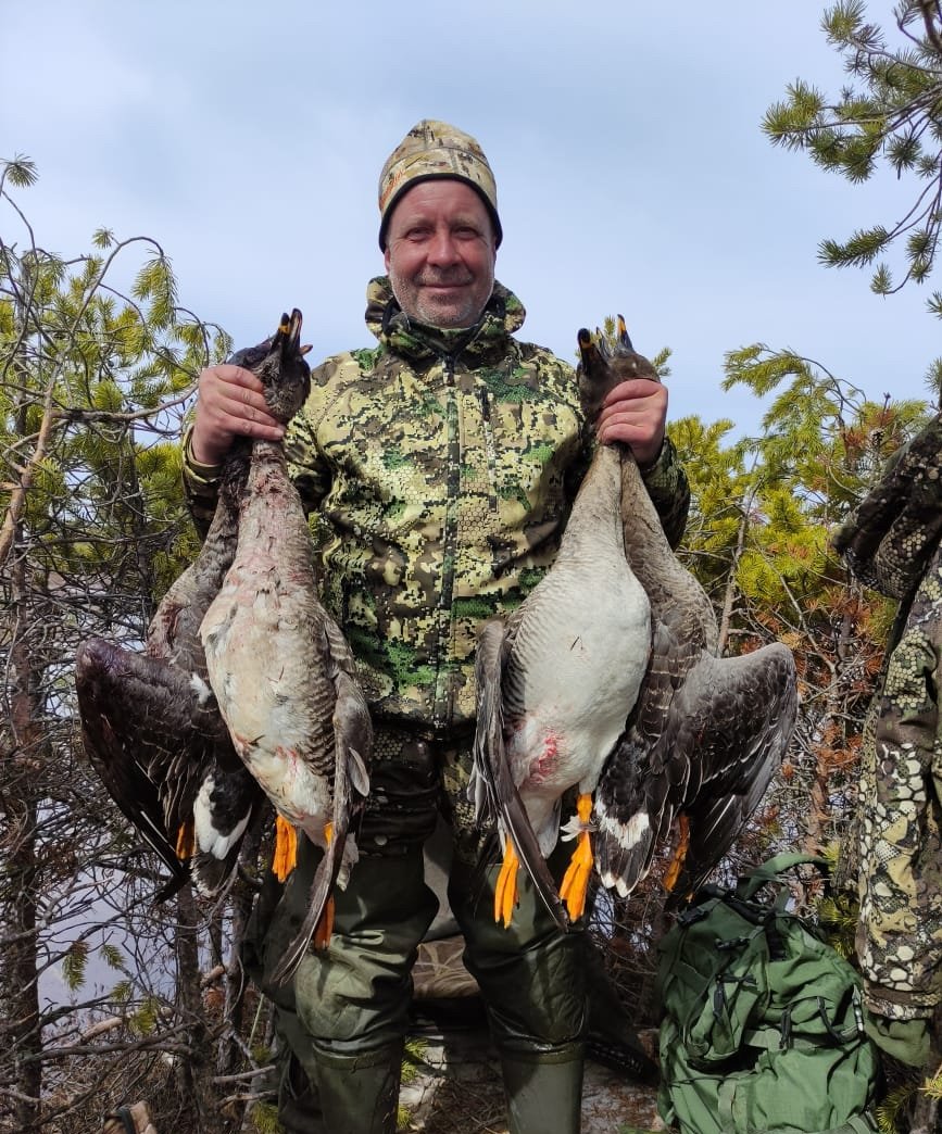 livi63 Posted May 9, 2024 Author #64 Report Share Posted May 9, 2024 (edited) Поездка в Виноградовский район позади. Расскажу об ее особенностях. Снега на болоте там уже не было, только в лесу лежал. Зато воды было необычно много. Пришлось поднимать выше затопленный пол скрадка, в чем не было необходимости последние 7 лет. Вездеход по болоту тоже шел очень тяжело, на грани буксования. Временно местного гуся на болотах было достаточно много. Он перелетал с одного болота на другое. На открытие мы с гостем очень хорошо постреляли. Обстрелянные гуси повторно к скрадку уже не подлетали, налетов, особенно близких, становилось все меньше и меньше. Транзит, на который мы надеялись, так и не появился. Погода стояла прохладная и ветреная, в скрадке было некомфортно. Я был лучше утеплен, чем гость, дольше смог находиться в скрадке. И в том числе и по этой причине Сергею в этот раз не удалось меня перестрелять. Мой постоянный гость Сергей Ш. после налета. В скрадке с добычей. Edited May 9, 2024 by livi63 livi63 Quote Link to post Share on other sites More sharing options...