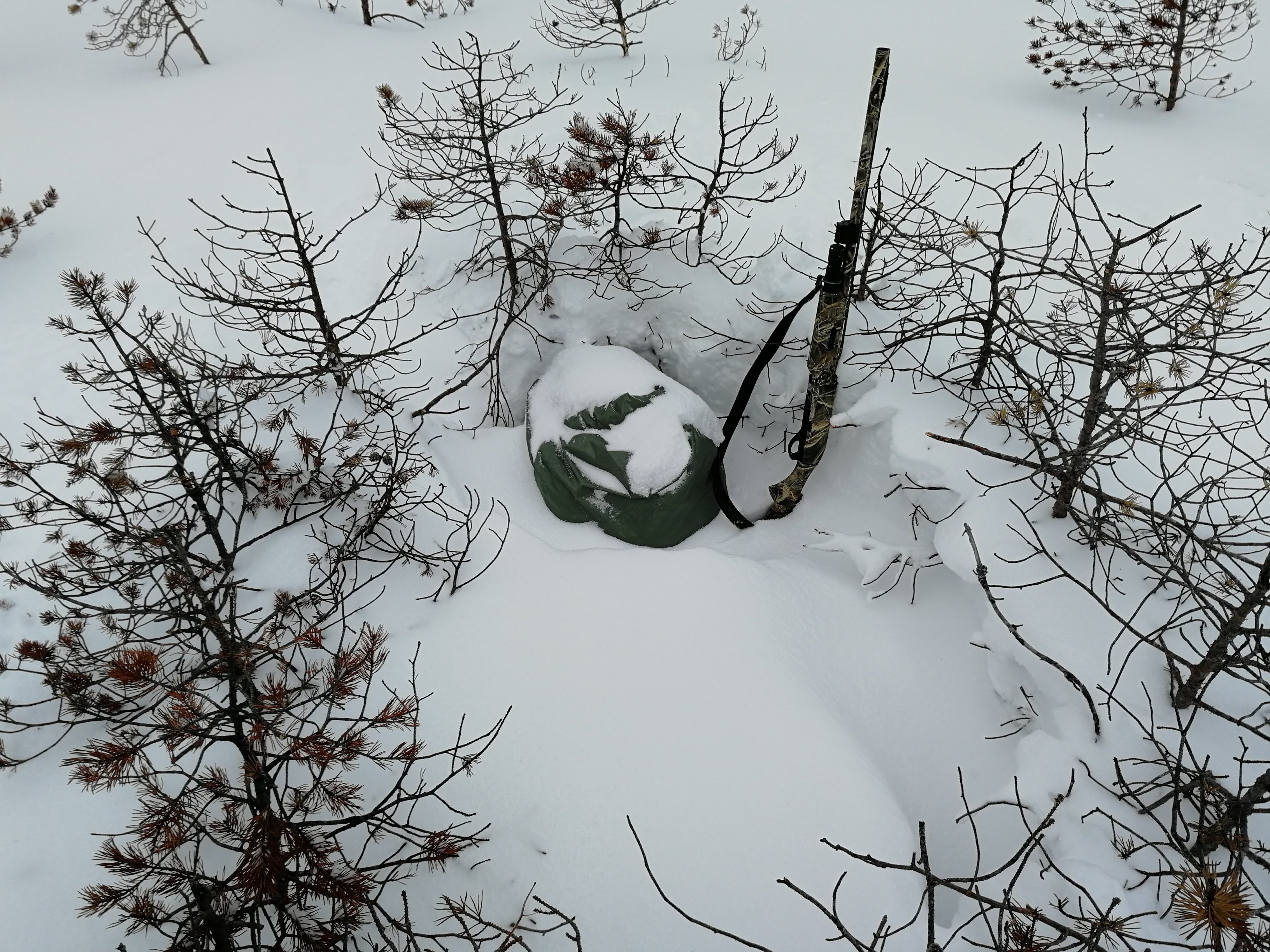 livi63 Posted April 13, 2024 Author #58 Report Share Posted April 13, 2024 Последние дни стояла плюсовая погода. Весь свежевыпавший снег полностью сдуло теплом. Наконец ночью немного приморозило, и я опять выбрался на снегоходе к местам охоты. Проехал по своим скрадкам, выкинул из них снег. Если скрадок находится на большом чистом болоте, или в его кромке, в метель сосенки скрадка работают как снегозадерживатель. Поэтому, при средней высоте снежного покрова на болоте в 20-30 см на сегодняшний день, в скрадке и около него уровень снега доходит до метра. И если весна вдруг окажется поздней, в скрадке к открытию охоты останется приличный сугроб. Чтобы уменьшить себе объем работ по очистке скрадков от снега непосредственно перед открытием охоты, я в последнее время практикую заблаговременную очистку скрадков от снега. Впрочем, как и очистку от снега полов под палатками и нар. В этом случае доски пола и нар успевают подсохнуть к открытию охоты. 1 livi63 Quote Link to post Share on other sites More sharing options...