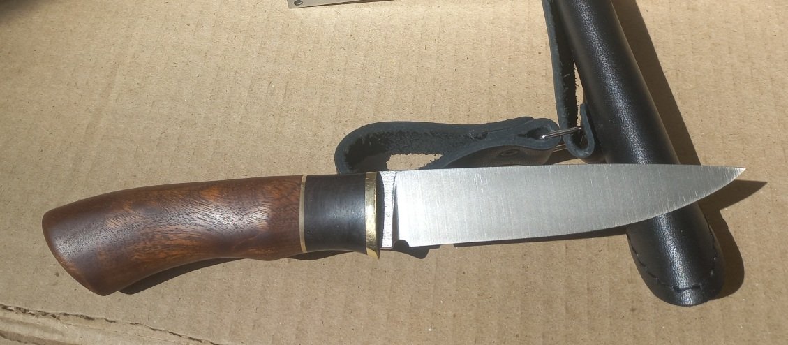 Popular Post Николай82 Posted June 2, 2024 Popular Post #1 Report Share Posted June 2, 2024 Иногда поделываю ножики. Образовались пару таких. Мне они никчему, может кому приглянутся. Собраны надёжно, по правилам ножеделия. Клинки имеют твёрдость 60-62 HRC, не мои, куплены у хорошего мастера, с его термичкой и закалкой холодом, имеющий диплом с выставки, на лучший рез. Рукояти из палисандра, с проставкой гренадил, больстер латунь. Пропитаны маслом даниш, высушены и отполированы с диалюксом. ТТХ: 1.клинок из AUS10Co 120х25х3,5 сведение от обуха в 0,3-0,4 мм. Рукоять 125 мм. Ножны на выбор, простые, со свободным подвесом 2. Клинок из 95Х18 122х26х4мм. Рукоять 124 мм. Не относятся к холодном оружию, по 2-м параметрам. 1. Отсутствует гарда высотой более 4х мм., либо отверстие под темляк, либо бочкообразность, более 8 мм. 2. Не имеют режущей кромки( не заточены) Имеются микрокосяки на рукояти, ввиде незаполерованых царапок на больстере(с торца на фото не они, так задуманно) Стоимость 5200 р. за 1-й, с царапкой на ножнах 5500 р. за 2-й 6 Николай82 Quote Link to post Share on other sites More sharing options...