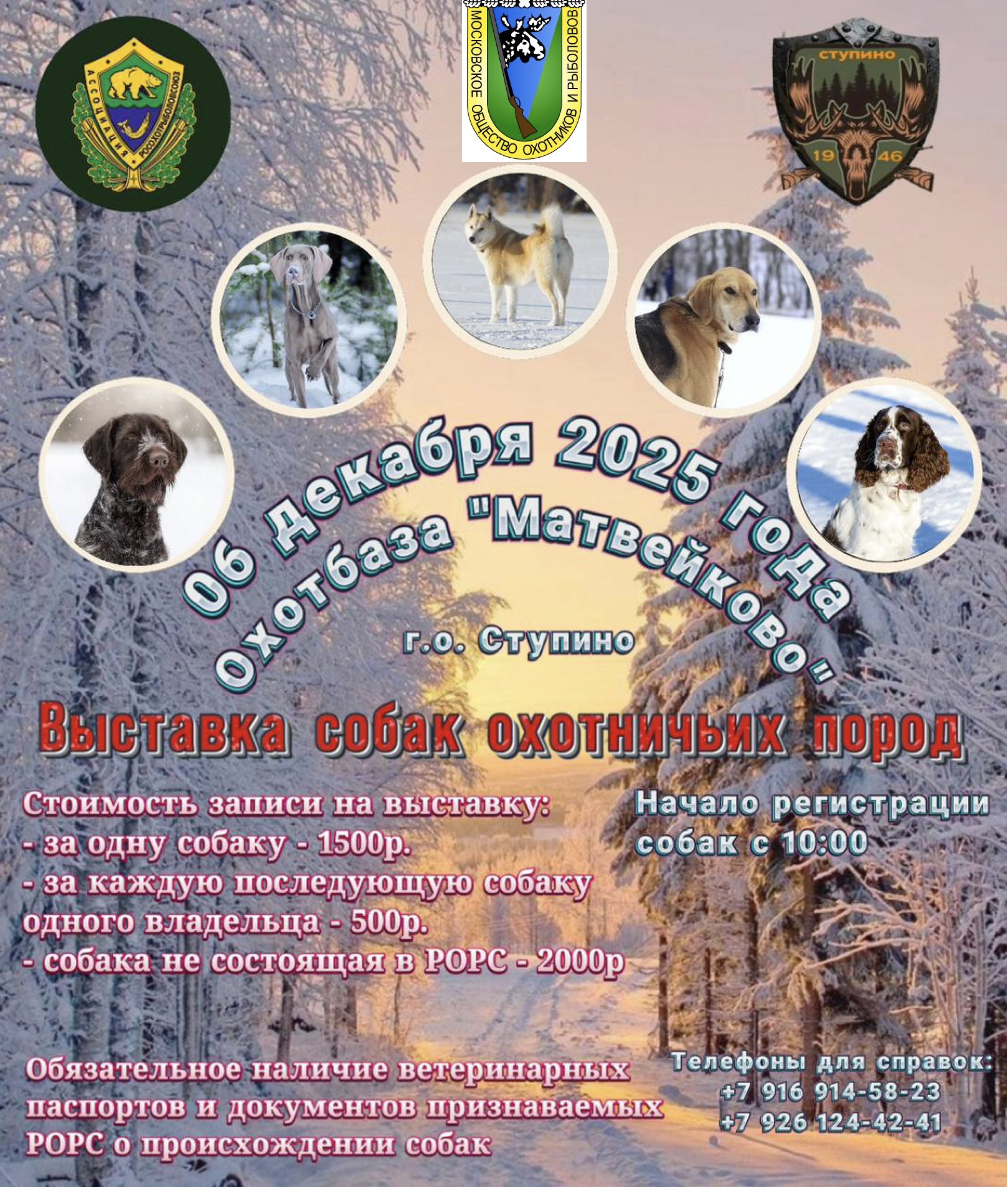 06 декабря 2025 года на охотбазе "Матвейково" пройдет выставка собак охотничьих пород
