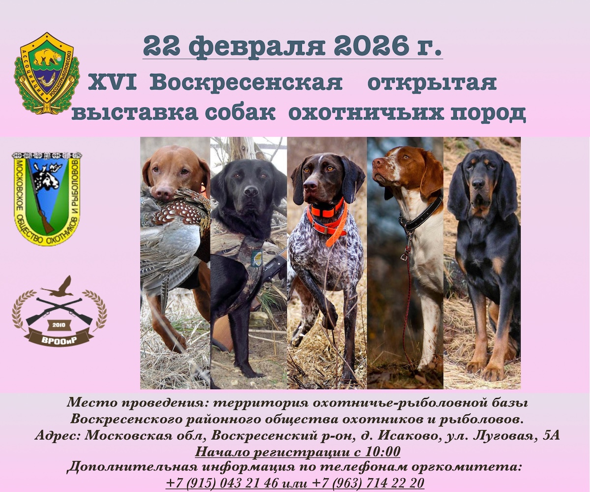 22 февраля 2026 года пройдет ХVI Воскресенская открытая выставка собак охотничьих пород.